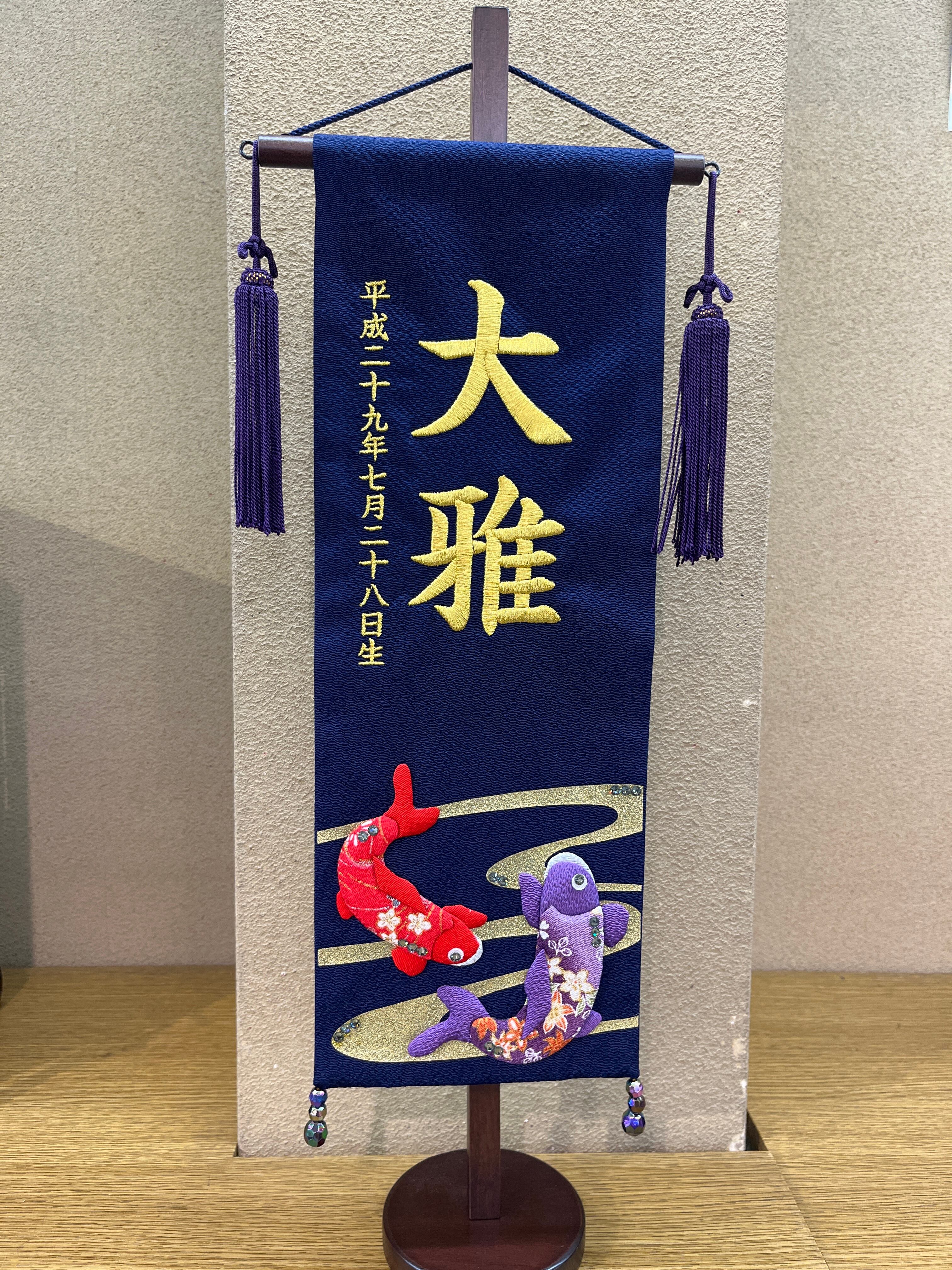 この名前旗は、大切な人への贈り物や自宅用の飾りとしてもおすすめです。特注のため他では手に入らない逸品であり、贈られた方にはきっと喜んでもらえることでしょう。華やかさと美しさが詰まったこの一枚をぜひご自宅やお祝いの場でご活用ください。